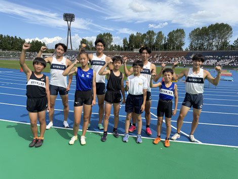 2025年10月2日,連合体育大会が行われ,金沢市の6年生が参加しました。お昼休みにエキシビションリレーが行われ,今年は井波くん,安田くん,馬渕さん,沖野くん,高山くん(補員)がチームを組んで参加しました。星稜大学生が15秒差でスタート,大接戦となり,同着でフィニッシュしました。会場は大盛り上がり!